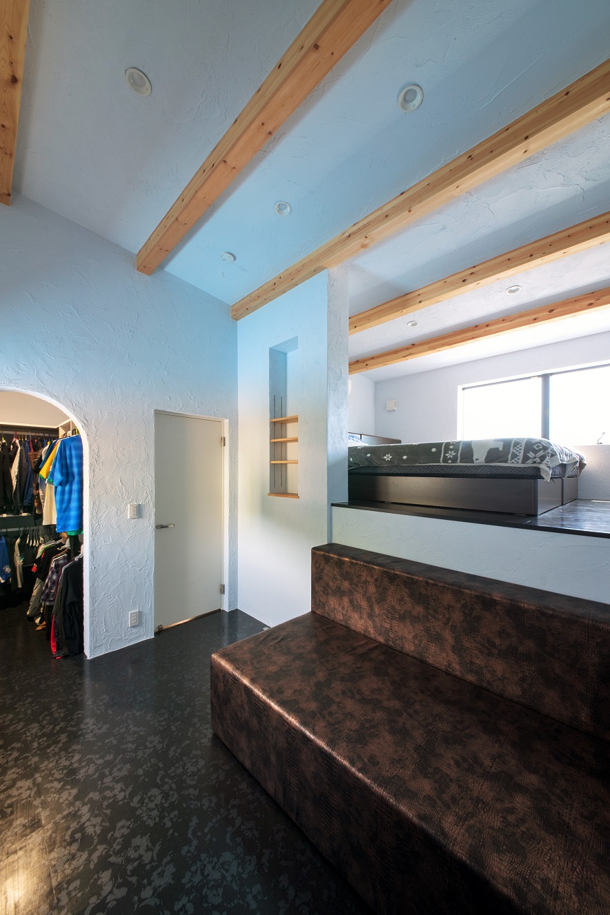 天井:珪藻土塗り 壁 :珪藻土塗り 木板張り、ウォールアート塗装 床 :塩ビタイル貼り 建具:木製・アルミサッシ